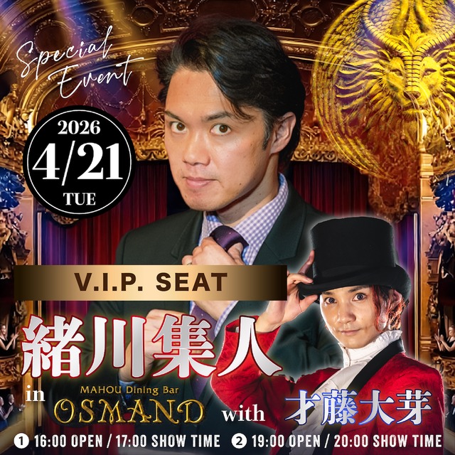 4/21(火) “緒川集人 in OSMAND with 才藤大芽” ※こちらは「ミニスナックプレート付き V.I.P.シート」の販売ページです。 世界を飛び回る緒川集人(ShootOgawa)さんと、 “国民的マジックの祭典!”出演の才藤大芽さん による1日限りの夢の共演! !!!!必ず下記をご確認下さい!!! 4/21(火)に 六本木 MAHOU Dining Bar OSMAND で行われるスペシャルイベントのご予約となります。 ※※当イベントは紙等でのチケット発券、発送は行いません※※ 4/21(火) ① 第1部 16:00 Open / 17:00 Start ❷ 第2部 19:00 Open / 20:00 Start ミニスナックプレート付き V.I.Pシート : 1人 11,000円 (税込) ドリンク付き ・ご注文後のキャンセルはできません。 ・お支払いが確認できた時点でご予約確定となります。 ・ご予約確定後の返金はできませんのでご注意ください。 ・お送りするメールは、システムの都合上「発送」となっておりますが、チケットの発送はありません。 ・当日は受付にてその"発送通知メール"をご提示下さい。 ・ご希望の回をお選びいただき、2名様以上での来店をご希望の場合は、カートに入れた後に数量をご指定ください。 ・スペシャルイベントの為、各テーブルでのマジックは行いません。 ・ショー中のビデオ撮影や写真撮影はNGとなります。写真撮影は案内があった時のみOKとなります。 ・お席が狭くなる可能性がございます、大きなお荷物の持ち込みはお控え下さい。 ・混雑が予想されます、時間に余裕を持ってお越し下さい。 ・出演者等へのプレゼントは常温保存が可能なもののみといたします。 ・メールアドレスやお名前など、お間違えのないようご注意下さい。 ・購入後の確認メールが届かない場合、メールアドレスが間違っている可能性があります。その場合は、お手数ですが、03-6447-0221(OSMAND)または、公式ウェブサイト( https://osmand.ssp-inc.jp )よりお問い合わせ下さい。
