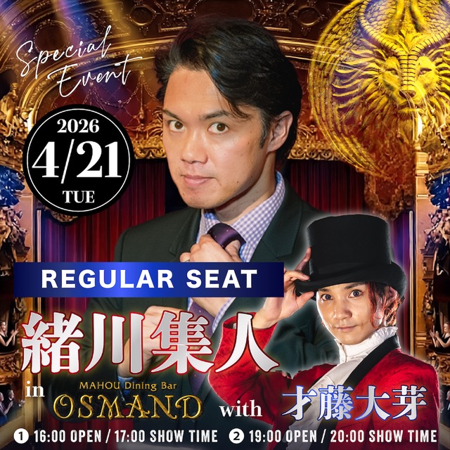 4/21(火) “緒川集人 in OSMAND with 才藤大芽” ※こちらは「レギュラーシート」の販売ページです。 世界を飛び回る緒川集人(ShootOgawa)さんと、 “国民的マジックの祭典!”出演の才藤大芽さん による1日限りの夢の共演! !!!!必ず下記をご確認下さい!!! 4/21(火)に 六本木 MAHOU Dining Bar OSMAND で行われるスペシャルイベントのご予約となります。 ※※当イベントは紙等でのチケット発券、発送は行いません※※ 4/21(火) ① 第1部 16:00 Open / 17:00 Start ❷ 第2部 19:00 Open / 20:00 Start レギュラーシート : 1人 6,600円 (税込) ドリンク付き ・ご注文後のキャンセルはできません。 ・お支払いが確認できた時点でご予約確定となります。 ・ご予約確定後の返金はできませんのでご注意ください。 ・お送りするメールは、システムの都合上「発送」となっておりますが、チケットの発送はありません。 ・当日は受付にてその"発送通知メール"をご提示下さい。 ・ご希望の回をお選びいただき、2名様以上での来店をご希望の場合は、カートに入れた後に数量をご指定ください。 ・スペシャルイベントの為、各テーブルでのマジックは行いません。 ・ショー中のビデオ撮影や写真撮影はNGとなります。写真撮影は案内があった時のみOKとなります。 ・お席が狭くなる可能性がございます、大きなお荷物の持ち込みはお控え下さい。 ・混雑が予想されます、時間に余裕を持ってお越し下さい。 ・出演者等へのプレゼントは常温保存が可能なもののみといたします。 ・メールアドレスやお名前など、お間違えのないようご注意下さい。 ・購入後の確認メールが届かない場合、メールアドレスが間違っている可能性があります。その場合は、お手数ですが、03-6447-0221(OSMAND)または、公式ウェブサイト( https://osmand.ssp-inc.jp )よりお問い合わせ下さい。